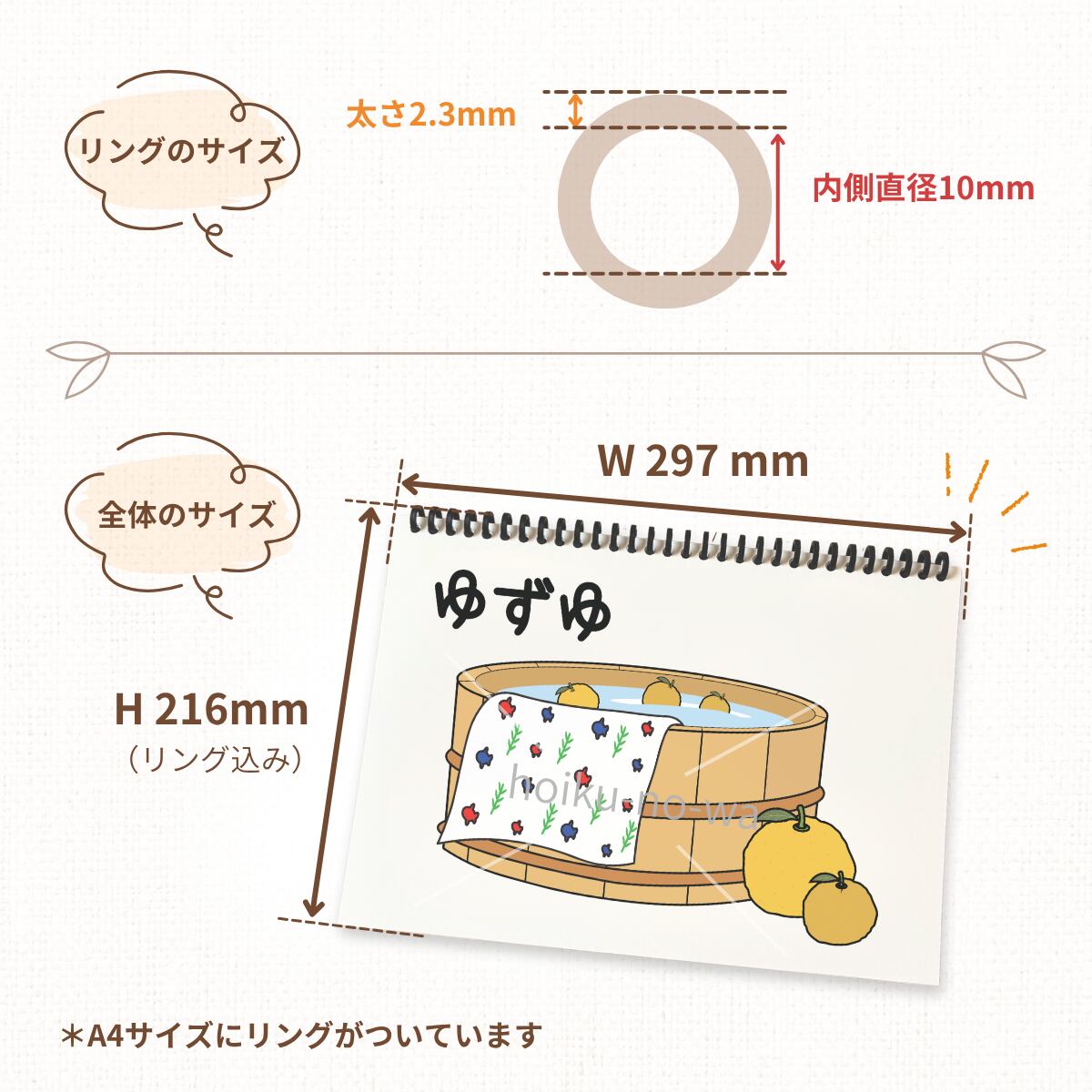 ・A4サイズ/リング付きでめくりやすく、子どもたちに見せやすい仕様。