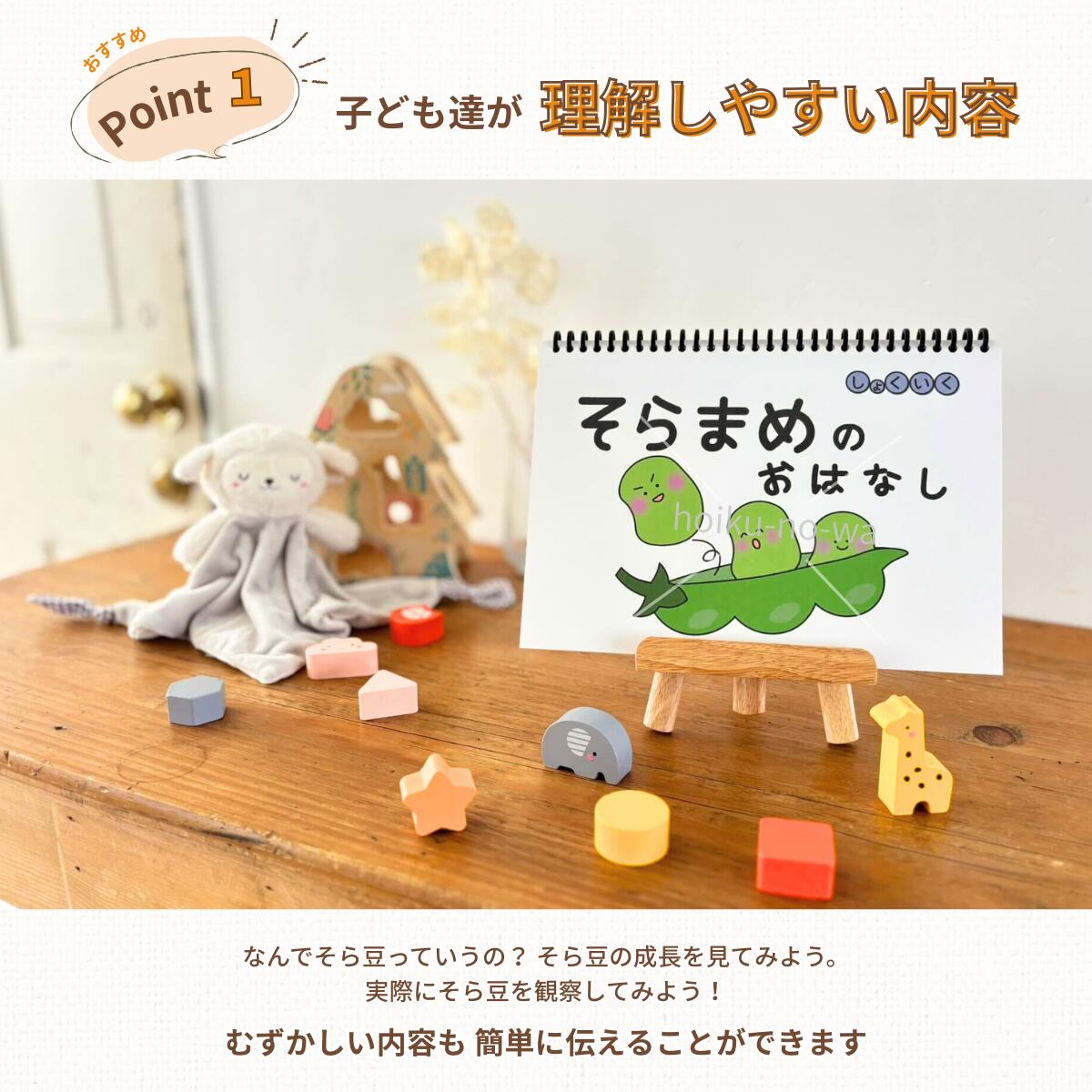 子どもたちにそら豆の成長を楽しく伝え、実際のそら豆に触れる前の導入として活用できる便利なスケッチブックシアターです。