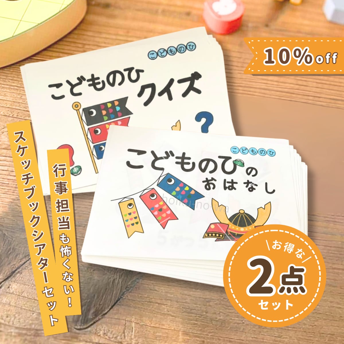 簡単に使えるスケッチブックシアターセットで、子どもたちと一緒に楽しくこどもの日のお話を楽しんでくださいね。