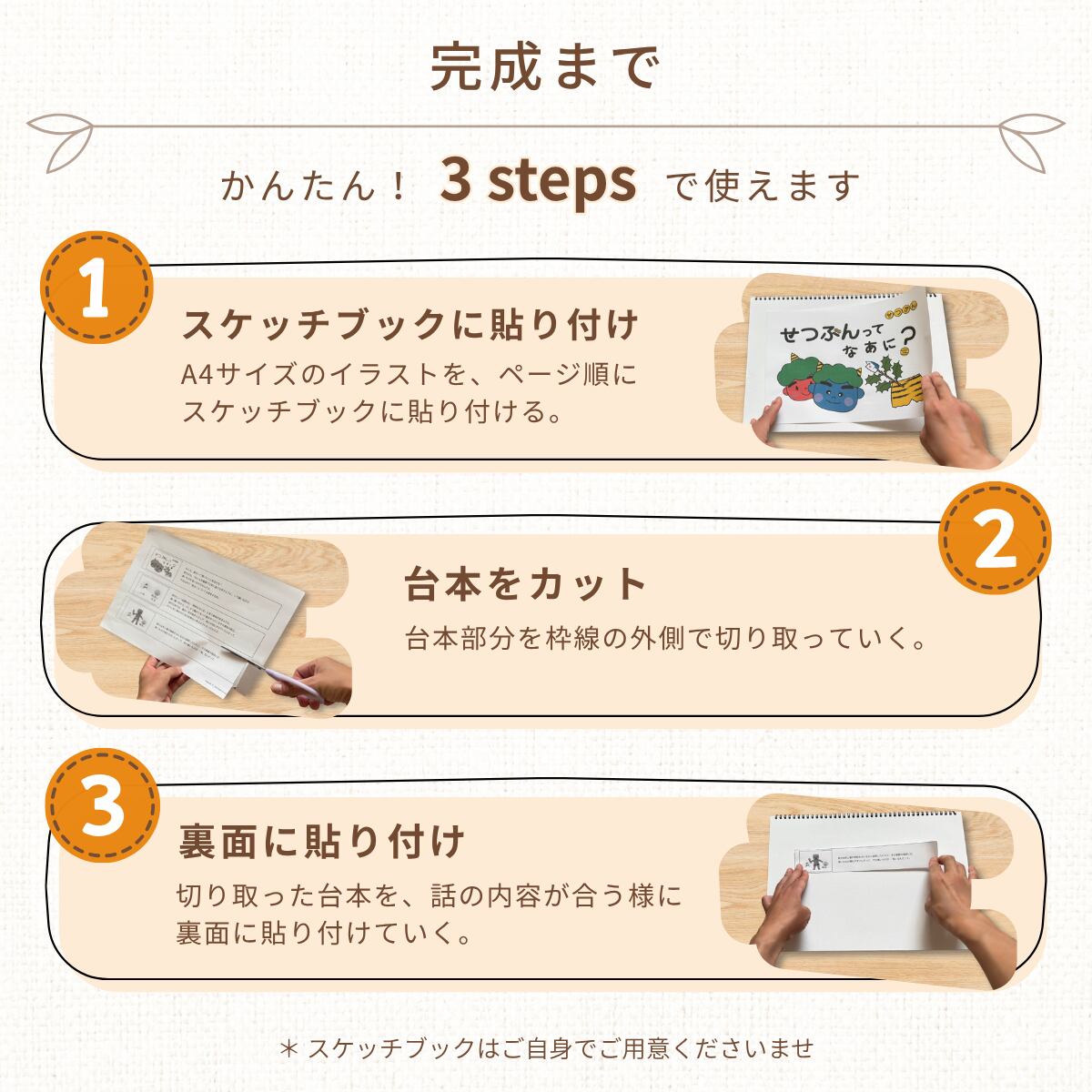 ・「演じ方(台本)」を切り取り裏面に貼り付けて完成!簡単に演じられて準備もラクラク。